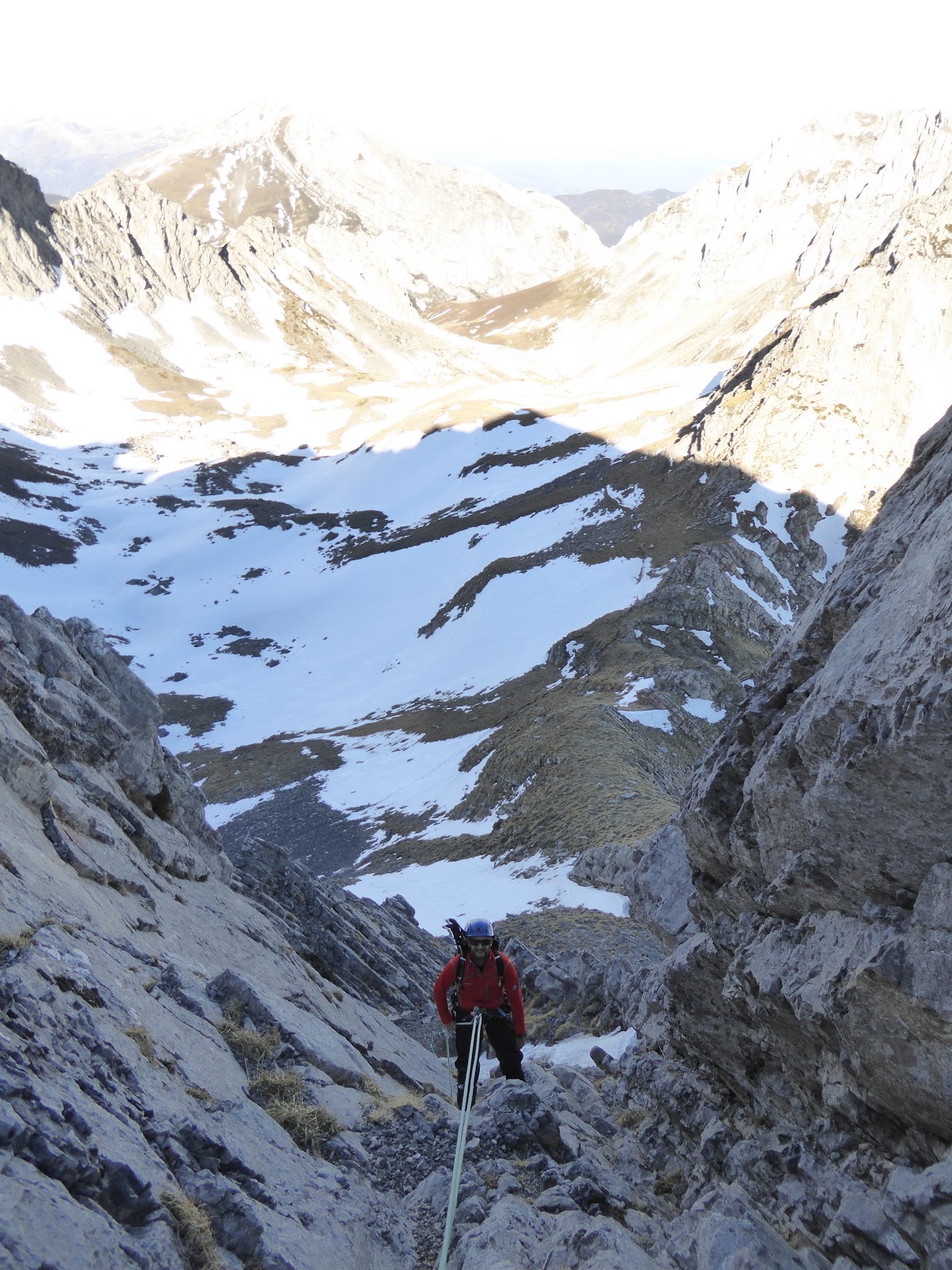 Procedemos con el rápel! Primero yo, asegurado desde arriba por Fernando. En pocos minutos habré descendido unos 30 metros. Turno para él, rapelando hasta mi altura. Nos quitamos de la pindia canal rapelada para recuperar la cuerda y continuamos. Varios metros más, sin ninguna complicación, y llegamos a la Forqueta del Portillín, donde aprovechamos para hacer una pequeña parada y quitarnos todo el material que llevamos encima, pues el resto del regreso sería sin peligro ninguno. La Forqueta del Portillín es un pequeño paso que conecta el Valle del Meicín y el Valle de Cueva Palacios y hace de collado entre el Portillín Oriental y el Pico del Canalón Oscuro.