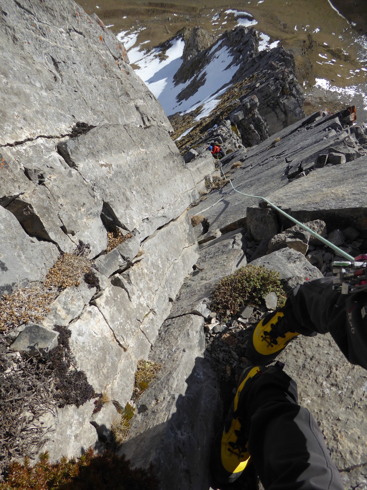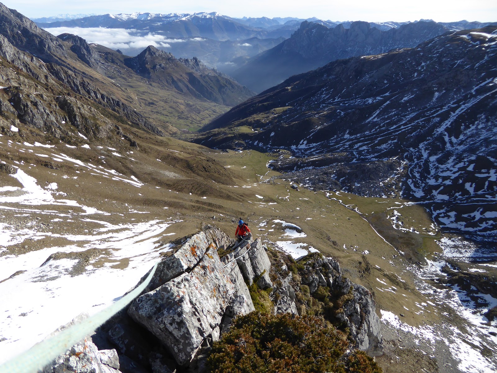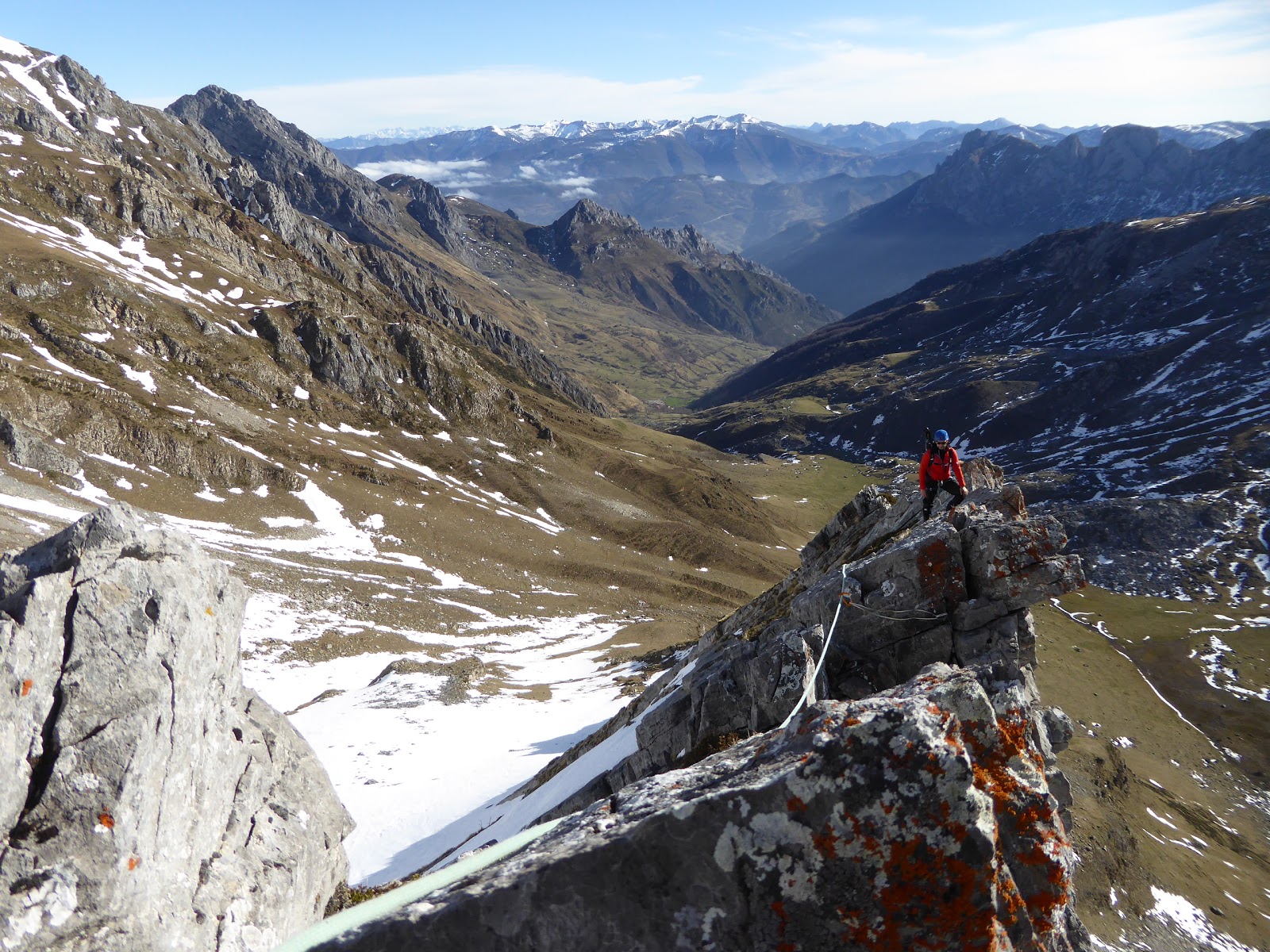 Durante toda la primera parte de la arista, hasta la primera reunión, se combinan pasos de grado II y III. Algún momento algo más complejo, pero vamos avanzando sin mayores problemas. Las vistas a ambos lados son espectaculares. Reunidos, volcado de material y rumbo a la segunda reunión!