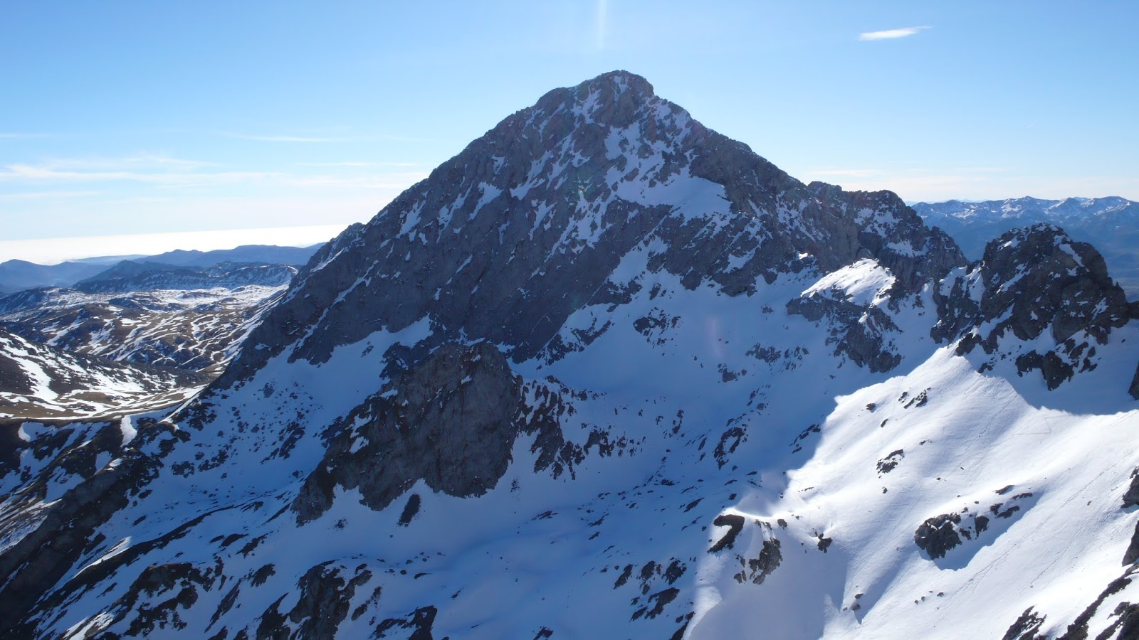 Superada la Forqueta del Portillín, descendemos por la nevada canal hasta el Refugio del Meicín. La nieve ya ha sufrido la transformación del paso de las horas, por lo que no es necesario el uso de material invernal. En ocasiones enterramos la pierna hasta la rodilla, pero vamos perdiendo altura rápidamente. Hacia la mitad del descenso, una mirada atrás para volver a recordar la preciosa arista sureste recorrida, ahora con una estampa nubosa preciosa.