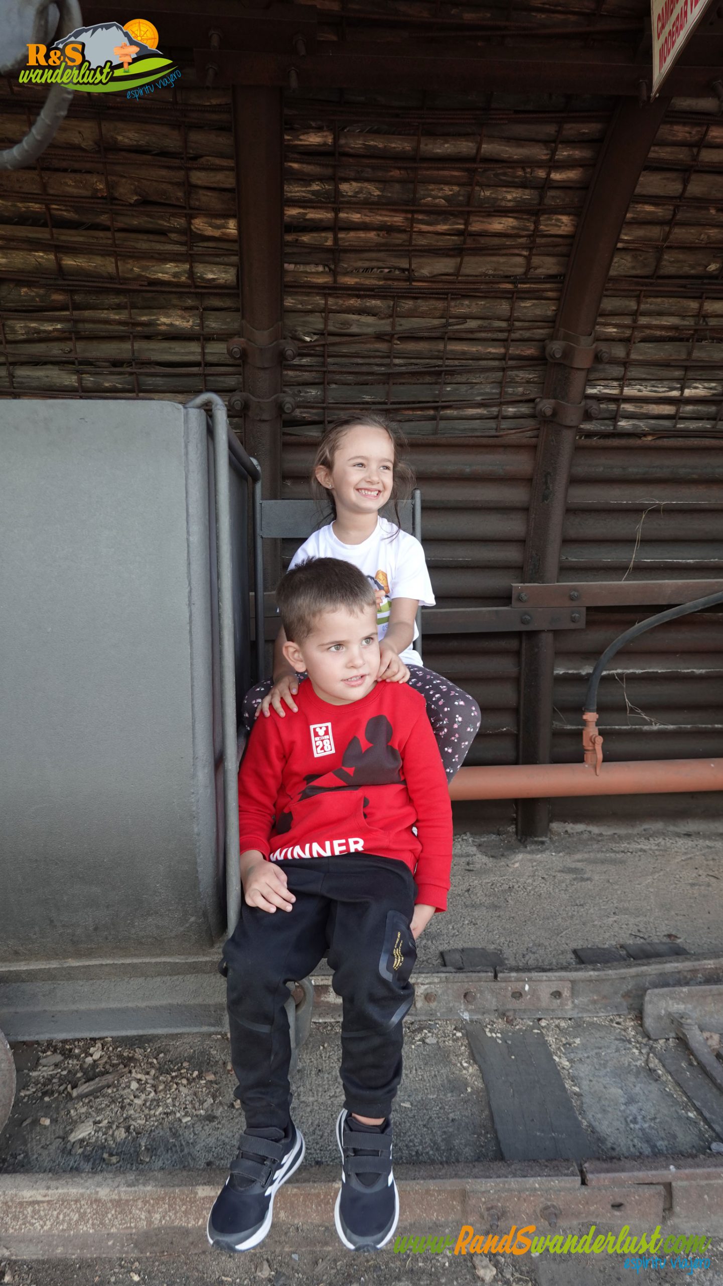 Los más pequeños posando junto a un vagón minero