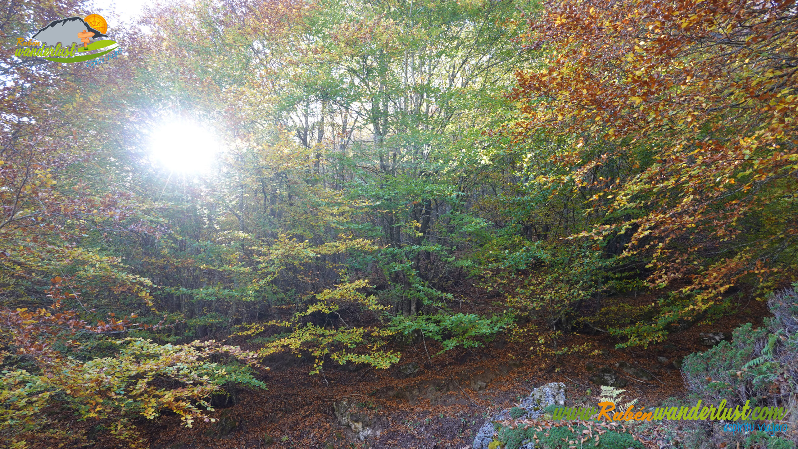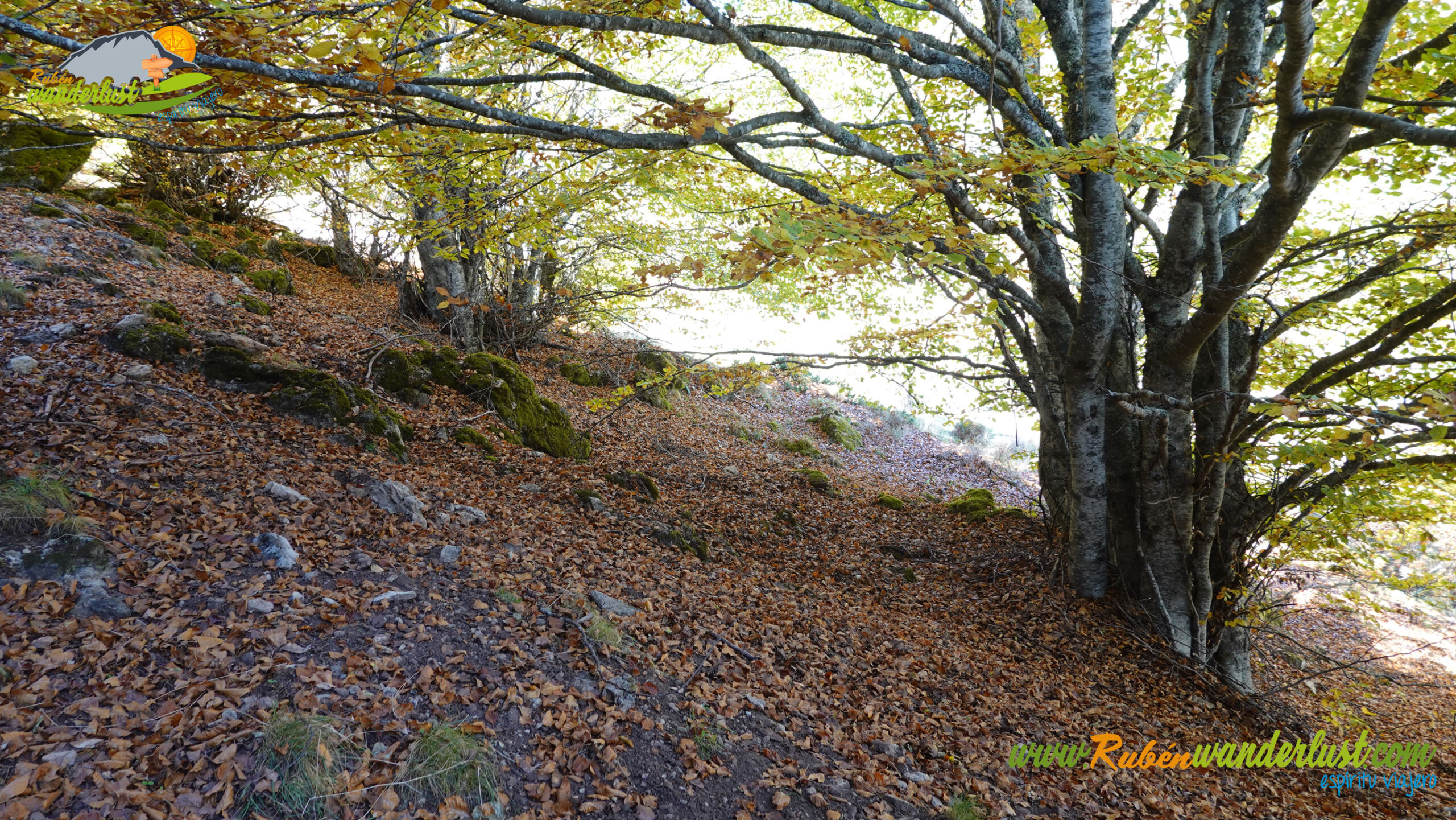 Después de un kilómetro y medio, llegamos al Hayedo Lagarejo, un bosque de hayas muy bonito. Vemos ejemplares preciosos y una variedad cromática muy guapa! Las vistas hacia atrás son fantásticas! Seguimos subiendo!