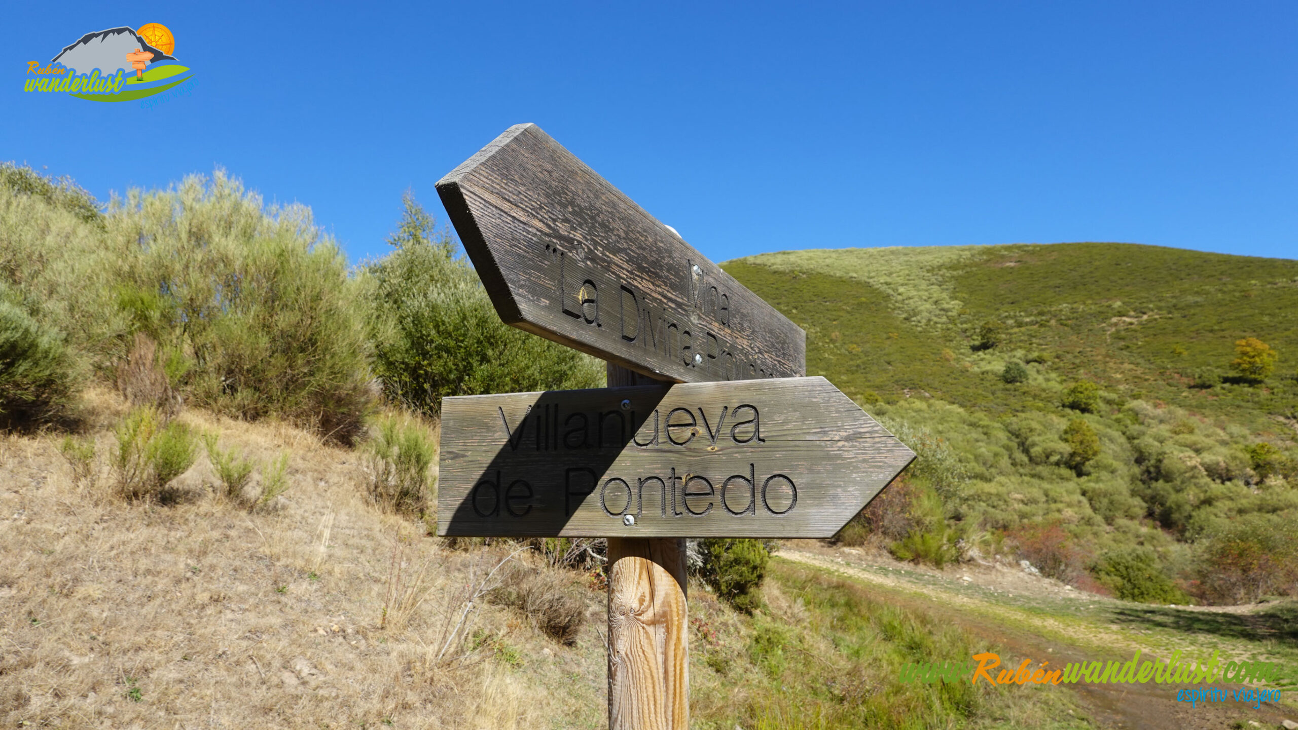 Pronto llegamos a una intersección en la que tendremos que desviarnos hacia la derecha, siguiendo indicaciones hacia Villanueva de Pontedo. Toca afrontar el resto del valle, ahora con rumbo este y continuando hacia el pueblo. El camino sigue siendo evidente y no ofrece ninguna complicación. Descartamos un desvío que se dirige hacia una edificación ganadera.